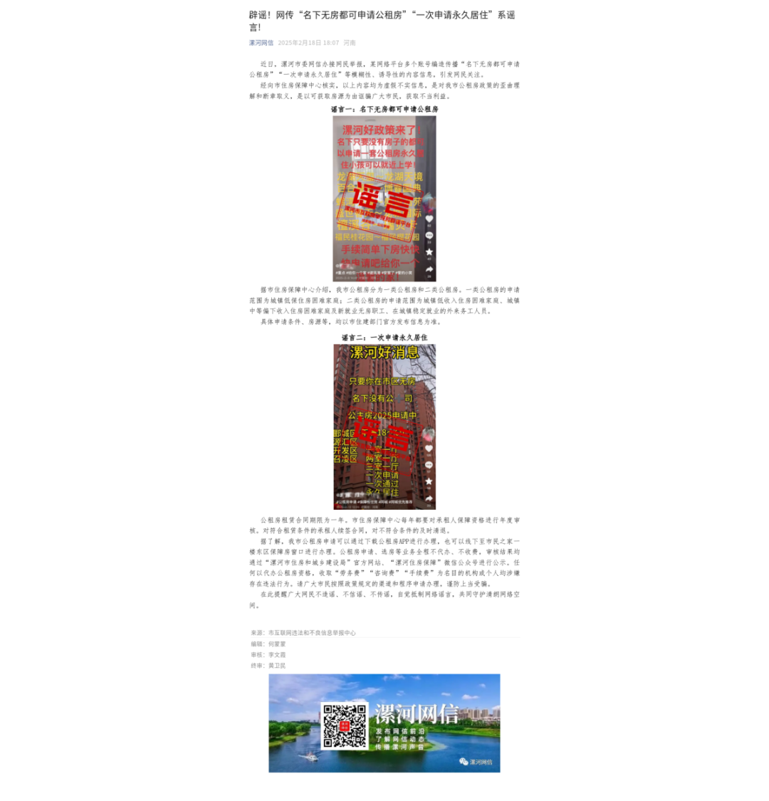 “名下无房都可申请公租房”“20多条成年鳄鱼进入澧河”“漯河一女子在街上被前男友捅死”“某网站涉赌博类、色情类有害信息”“某平台账号发布涉企侵权不实信息”……